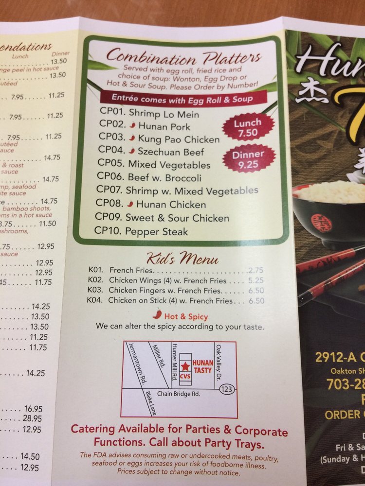 Welcome to Hunan Tasty, a delightful Chinese culinary gem located in Oakton, Virginia. This vibrant eatery serves up an array of authentic dishes that highlight the bold flavors of Hunan cuisine. With a menu brimming with options, guests can indulge in classic favorites like Fried Rice Dinners, featuring succulent choices such as fried chicken wings and shrimp, all priced at an accessible $11.95.